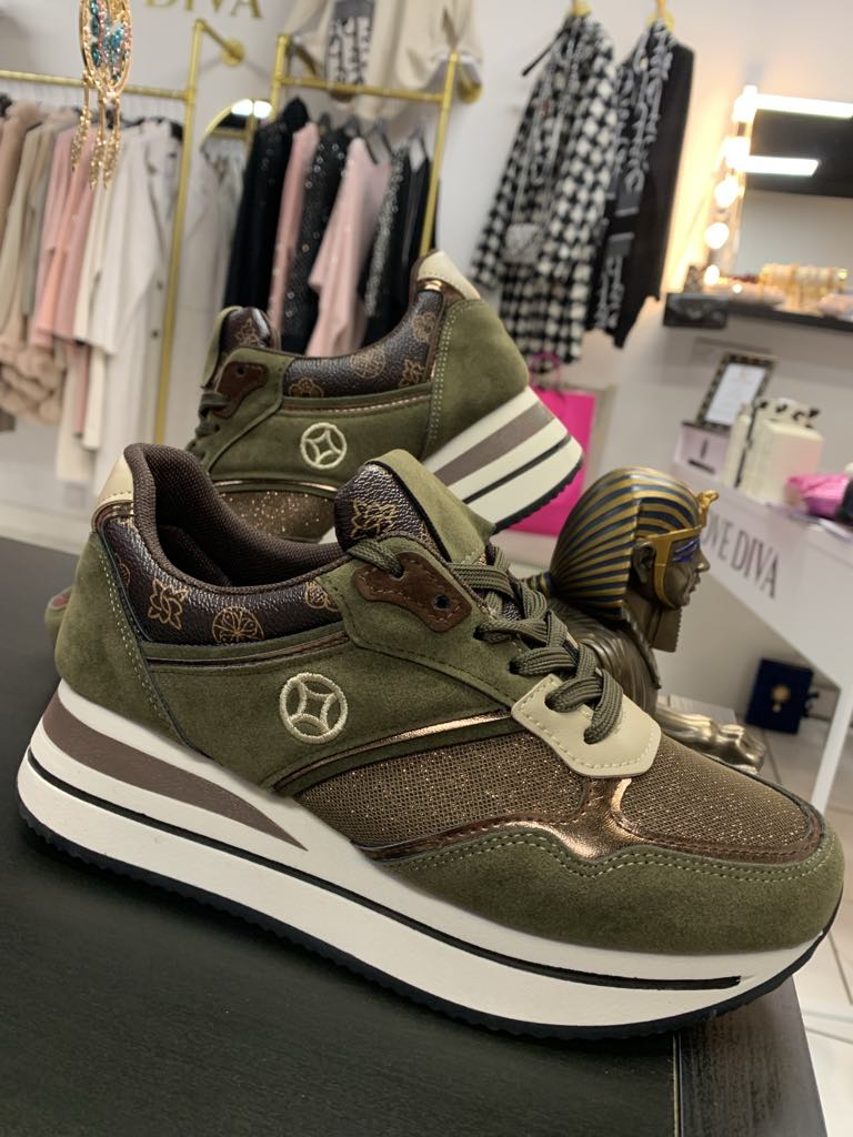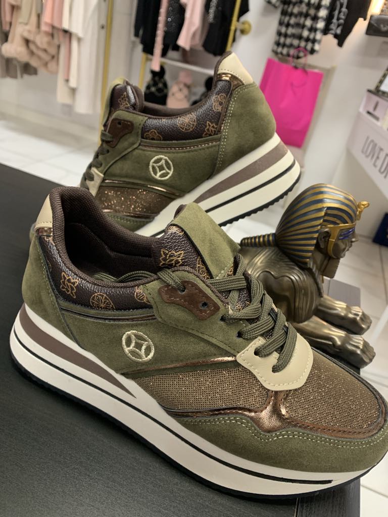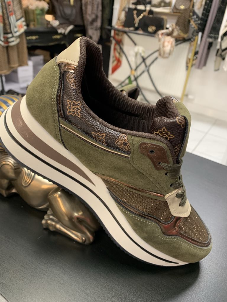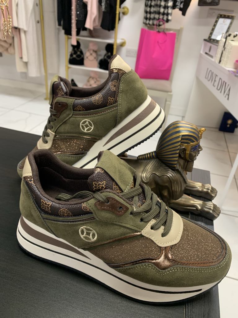 Gorgeous wedge trainers in Olive and Brown, inspired by LV. Look great with our wide legged trousers and dresses
