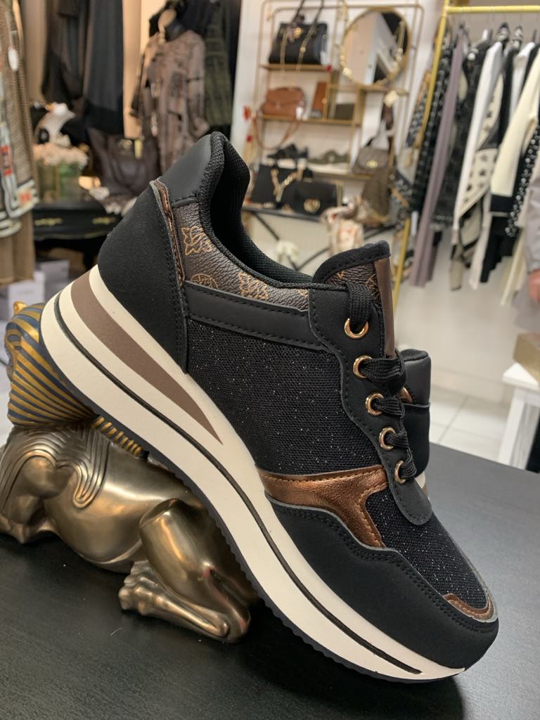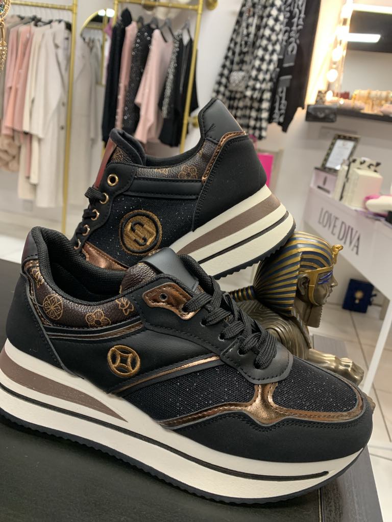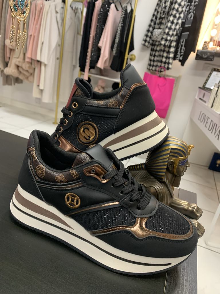 Gorgeous wedge trainers in Black and Rose Gold, inspired by LV. Look great with our wide legged trousers and dresses.